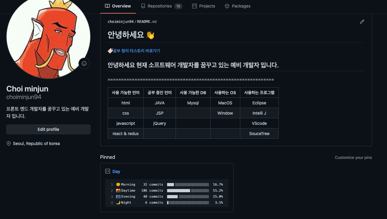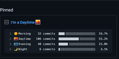 위 사진처럼 내가 커밋하는 시간을 Github 프로필 메인에 나타낼 수 있다.