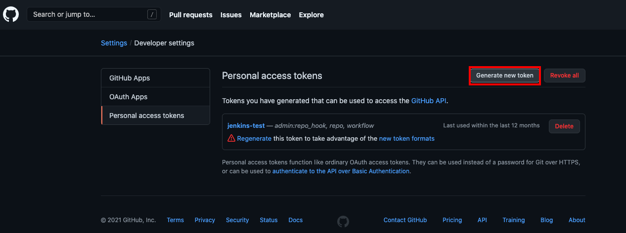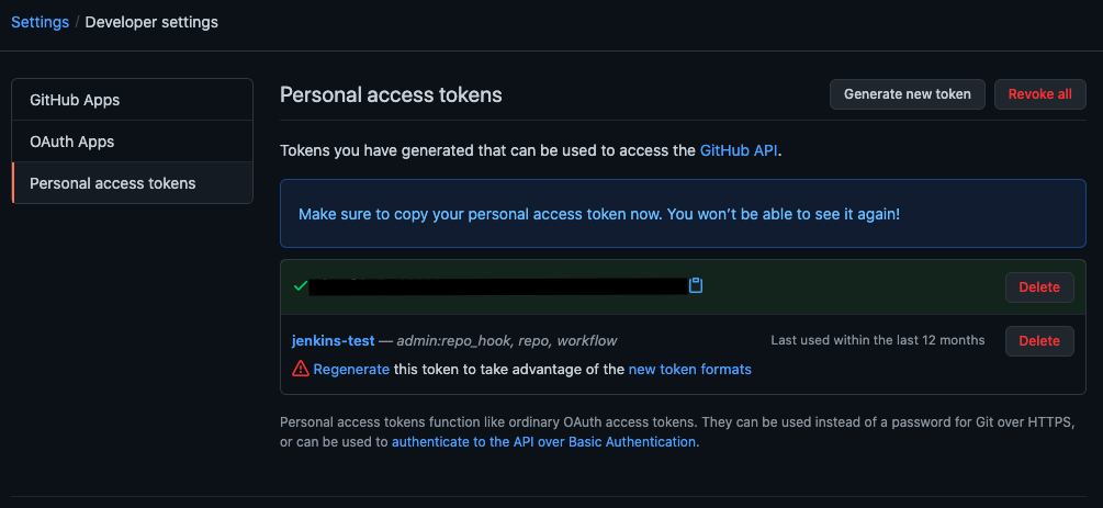 Generate new token 을 눌러 새로운 토큰을 생성합니다.