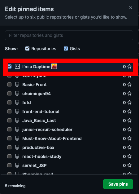 (이는 프로필에 무슨 레포지토리를 보여줄지를 설정하는 곳이다.)