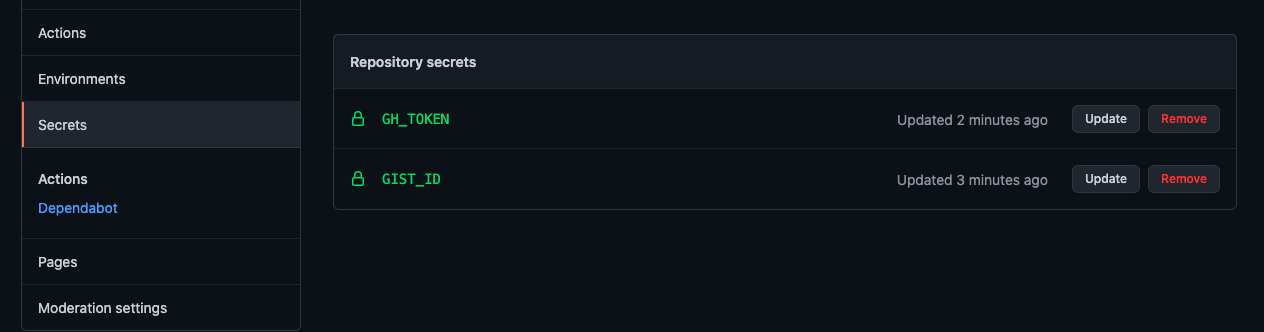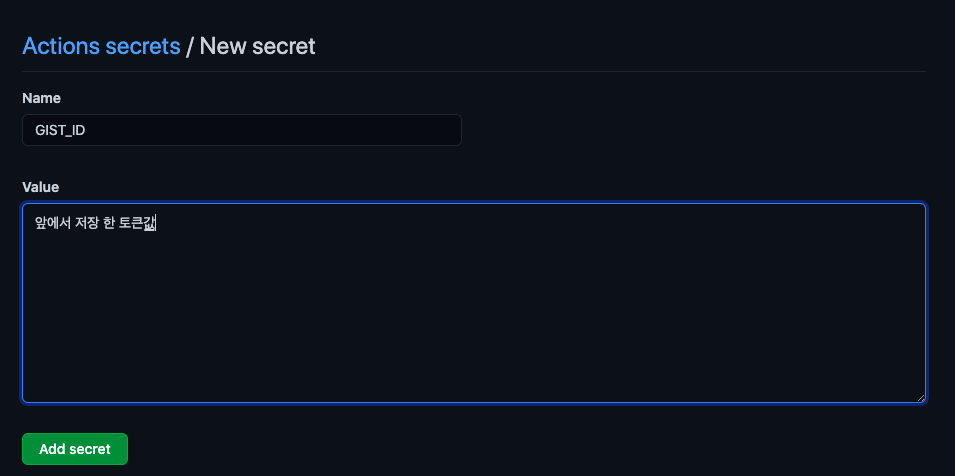 Name을 각각 GIST_ID, GH_TOKEN으로 하여 저장해둔 각각의 값들을 넣어 환경 변수를 생성합니다.