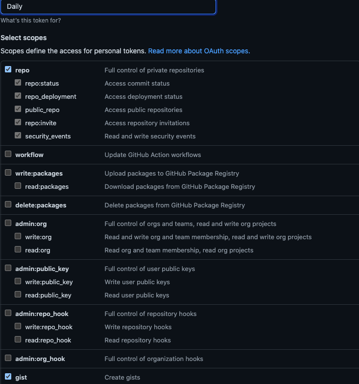 이름을 입력후 "repo"와 "gist"를 체크하고 맨밑으로 내려서 생성한다.