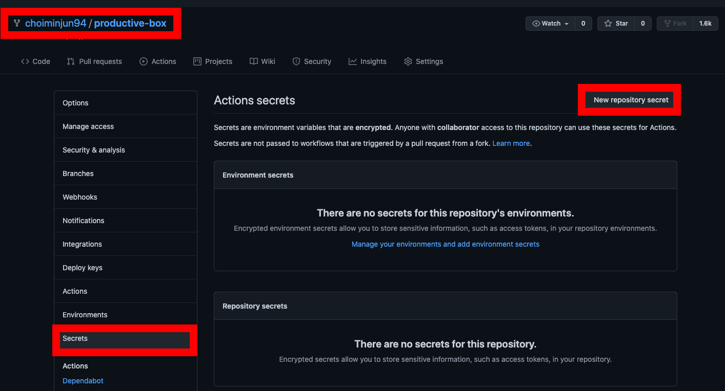 Fork 했던 repository로 돌아가서 settings > Secret 로 들어갑니다.