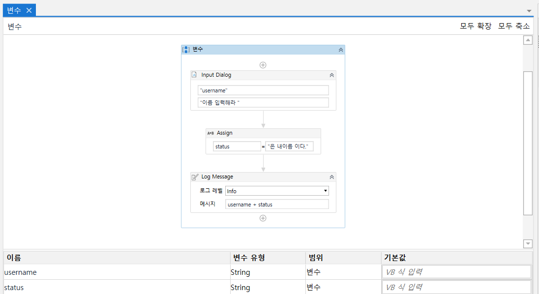 변수의 값은 외부 입력, 데이터 조작 또는 한 활동에서 다른 활동으로 전달을 통해 변경될 수 있습니다.
