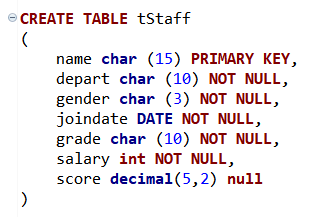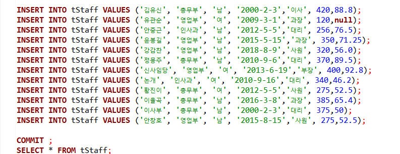 INSERT INTO tStaff VALUES ('황진이', '총무부', '여', '2012-5-5','사원', 275,52.5);