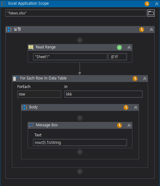 Excel Application Scope을 사용하여 News라는 엑셀을 먼저 실행 시킨다.