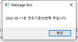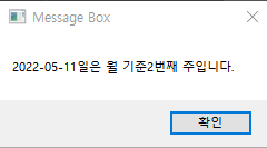 Date_CurrentDate.ToString("yyyy-MM-dd")+ "일은 월 기준" + Int_WeekOfMonth.ToString() + "번째 주입니다."