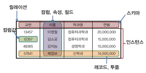 컬럼(열)과 로우(행)을 이루는 하나 이상의 데이블이 존재하고 데이블에 데이터가 저장