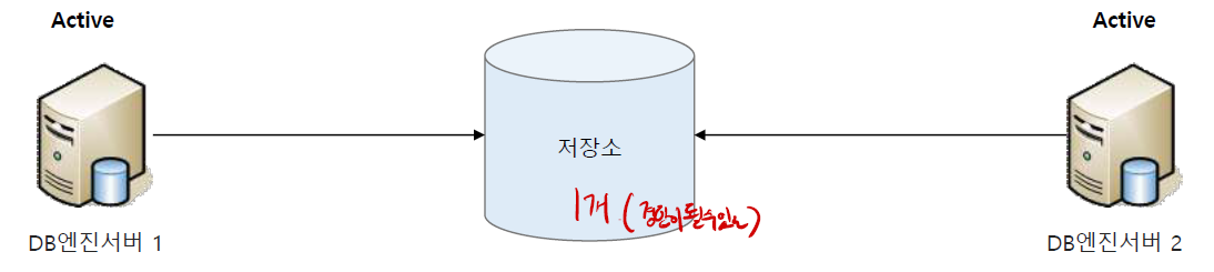 | Active-Active | - 두개의 DBMS 서버 동시 가동 - 저장소는 1곳만 있다. - 성능상 유리 - 저장소의 병목현상이 발생 시 순간적으로 성능문제가 발생 할 수 있다. - Oracle이 대표적 이다. |