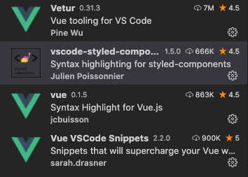 - Vue VSCode Snippets : Vue 문법을 미리 알려주는 친구입니다.