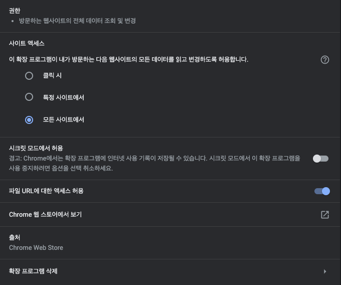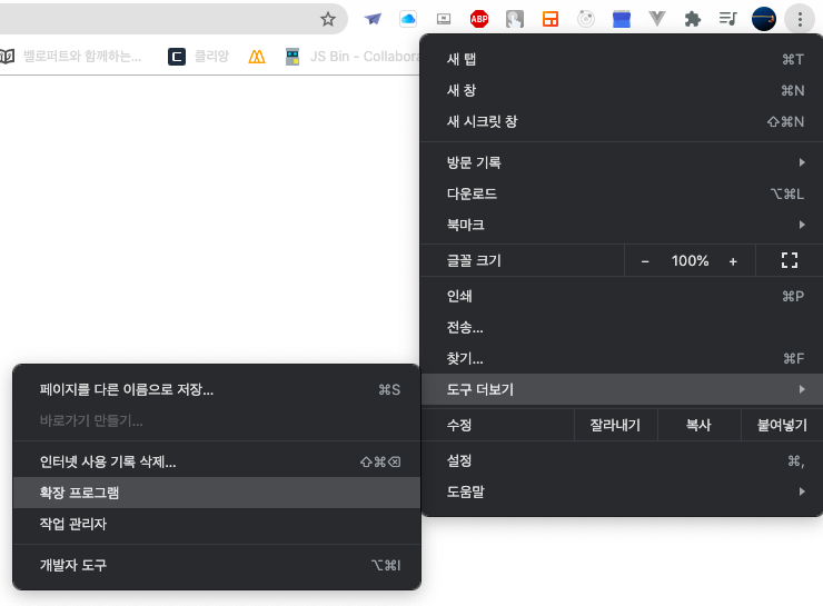 이후 [: → 도구 더보기 → 확장 프로그램]을 클릭