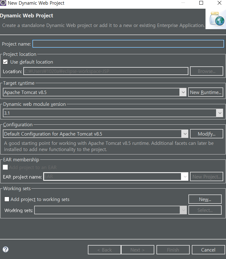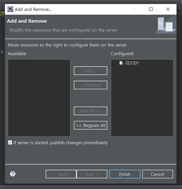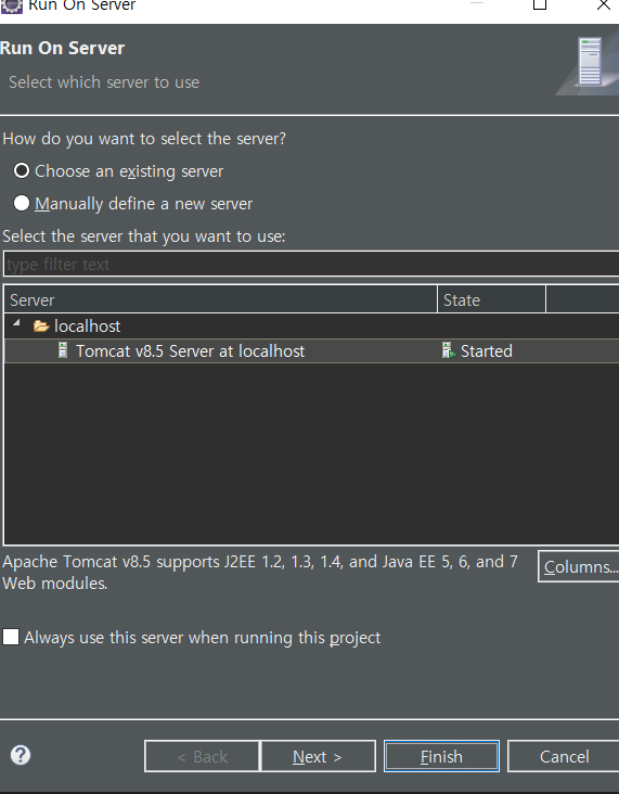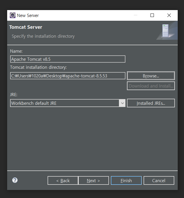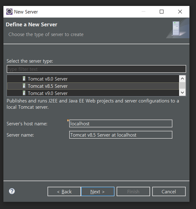 위치 저장 이후 [Finish]를 입력 합니다. 이러면 이클립스에 서버가 설치 됩니다.