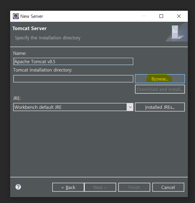 이후 [Browse]를 누르고 자신의 톰캣저장 위치를 입력 합니다.