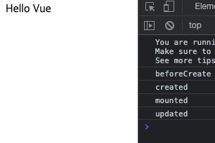 뷰 라이프 사이클 순서대로 beforeCreate, created, mounted는 정상대로 출력 되었지만 updated 속성 함수는 호출되지 않는다.
