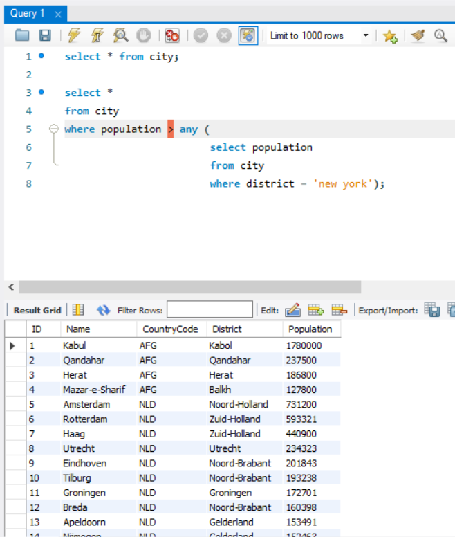서브쿼리의 여러 개의 결과 중 한 가지만 만족해도 가능