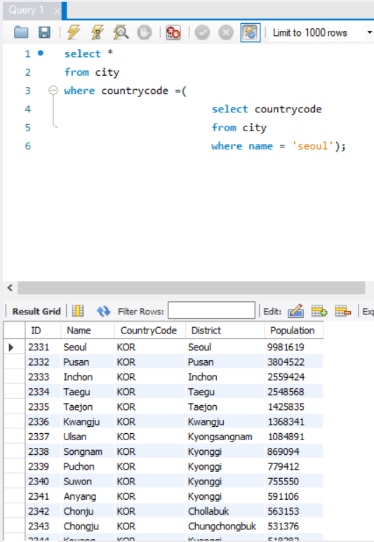 서브 쿼리의 결과가 둘 이상이 되면 에러가 발생