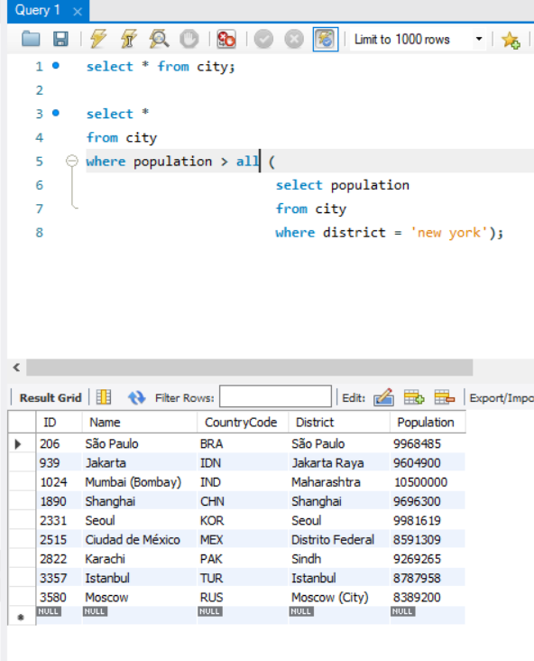 서브쿼리의 여러 개의 결과를 모두 만족 시켜야 함
