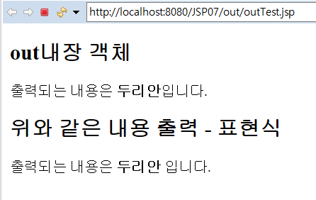 out객체는 JSP페이지가 생성한 결과를 웹 브라우저에 전송해 주는 출력 스트림이며, JSP페이지가 웹브라우저에게 보내는 모든 정보는 out객체를 통해 전송