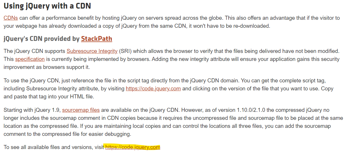 이후 페이지를 조금 내려서 Using jQuery with CDN를 찾아 형광색으로 체크한 링크로 들어가거나밑에 링크로 들어간다.